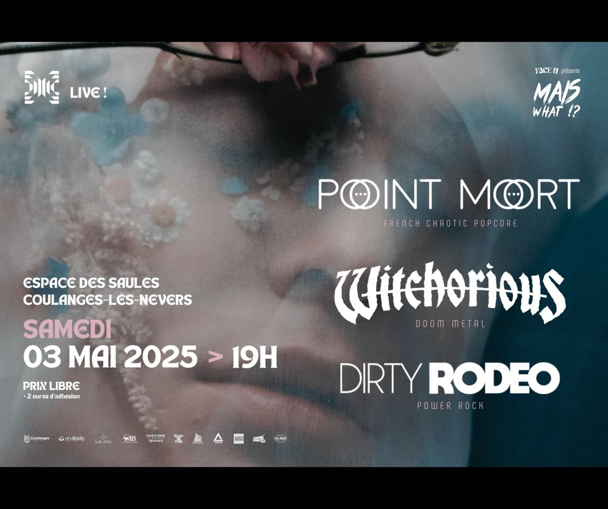 L’asso Face B qui organise l’évènement s’est encore décarcassé pour proposer au public Rock / Metal 3 groupes des plus prometteurs issus de notre scène hexagonale. Power Rock, Heavy Doom et Post Metal seront au programme avec avec Dirty Rodeo, Witchorious et Point Mort.